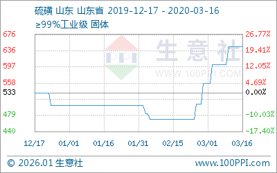 据生意社价格监测显示,目前华东地区硫磺生产价在646.67元/吨,较3月1日涨幅16.17,较去年同期下调43.44%。[详细]