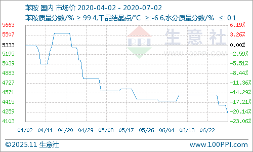 7月2日,山东地区苯胺价格4100-4180元/吨;南京地区苯胺价格4300元/吨。