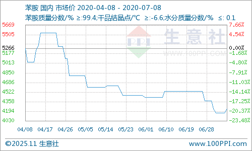 7月8日,山东地区苯胺价格4200-4280元/吨;南京地区苯胺价格4300元/吨。