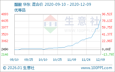 据生意社大宗数据监测显示,受市场货源紧张影响,国内醋酸市场大幅上行,三日内涨幅超过500元/吨,截至12月9日,山东地区4300-4450元/吨,江苏地区5200-5300元/吨,浙江地区5300-5400元/吨,河南地区4600-4750元/吨左右,河北地区4450-4500元/吨,西北地区4200-4350元/吨左右,华南地区5300-5400元/吨左右,整体较月初涨幅28.77%。[详细]