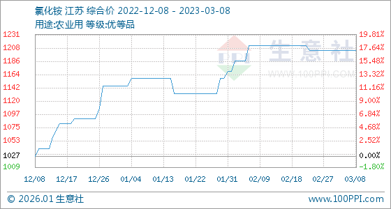 3月8日,生意社氯化铵基准价为1205.00元/吨,与本月初持平。
