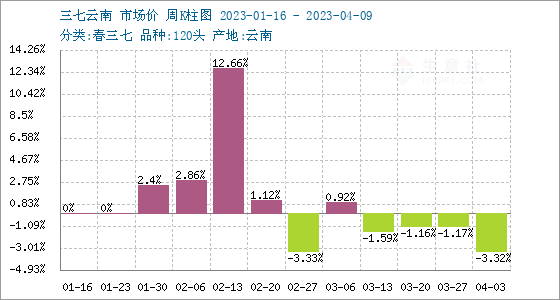 4月10日,生意社三七基准价为102.00元/公斤,与本月初(105.50元/公斤)相比,下降了-3.32%。