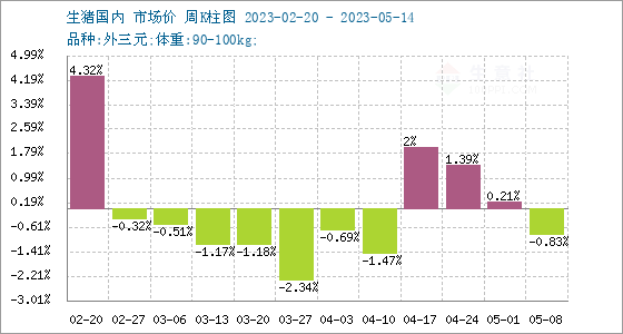5月16日,生意社生猪基准价为14.33元/公斤,与本月初(14.57元/公斤)相比,下降了-1.65%。