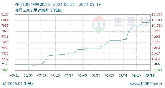 9月19日,生意社PP(纤维)基准价为8000.00元/吨,与本月初(7650.00元/吨)相比,上涨了4.58%。