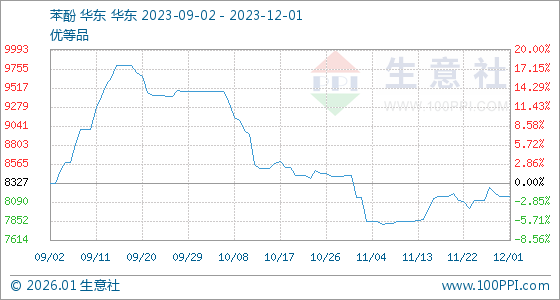 12月1日,生意社苯酚基准价为8157.50元/吨,与上月初(8425.00元/吨)相比,下降了-3.18%。