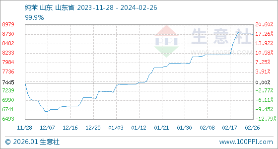 2月26日,生意社纯苯基准价为8758.83元/吨,与本月初(7967.17元/吨)相比,上涨了9.94%。