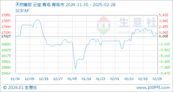 2月28日,生意社天然橡胶基准价为17132.00元/吨,与本月初(16840.00元/吨)相比,上涨了1.73%。