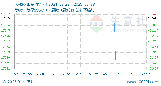 3月28日,生意社人棉纱基准价为17550.00元/吨,与本月初(17625.00元/吨)相比,下降了-0.43%。