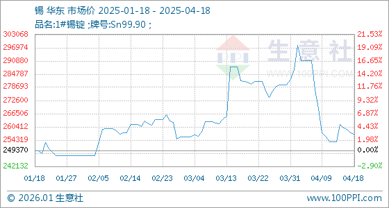 4月18日,生意社锡基准价为257600.00元/吨,与本月初(282290.00元/吨)相比,下降了-8.75%。