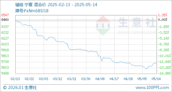 5月14日,生意社锰硅基准价为5686.00元/吨,与本月初(5640.00元/吨)相比,上涨了0.82%。