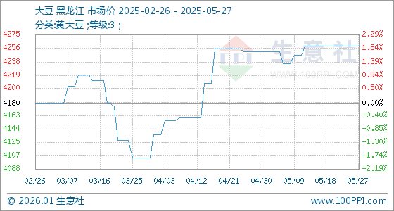 5月27日,生意社大豆基准价为4260.00元/吨,与本月初(4252.00元/吨)相比,上涨了0.19%。