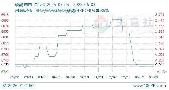 6月3日,生意社磷酸基准价为6730.00元/吨,与本月初持平。
