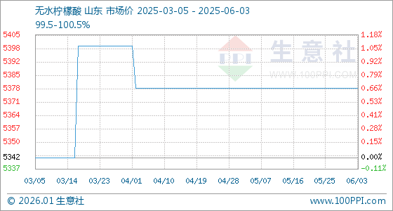 6月3日,生意社无水柠檬酸基准价为5378.57元/吨,与本月初持平。