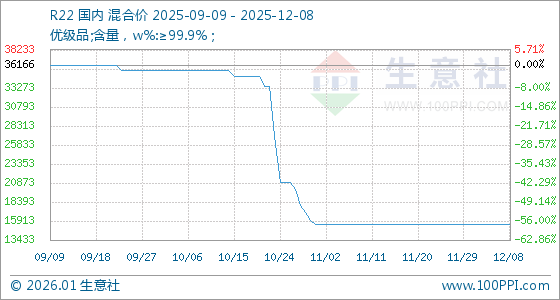 12月8日,生意社R22基准价为15500.00元/吨,与本月初持平。