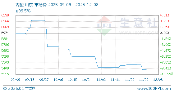 12月8日,生意社丙酸基准价为5402.50元/吨,与本月初(5393.75元/吨)相比,上涨了0.16%。