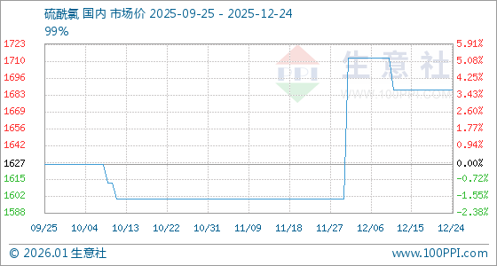 12月24日,生意社硫酰氯基准价为1687.50元/吨,与本月初(1600.00元/吨)相比,上涨了5.47%。