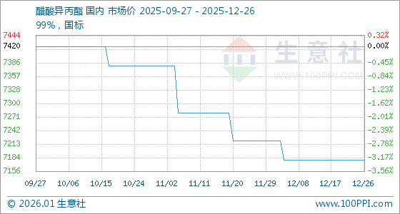 12月26日,生意社醋酸异丙酯基准价为7180.00元/吨,与本月初(7220.00元/吨)相比,下降了0.55%。