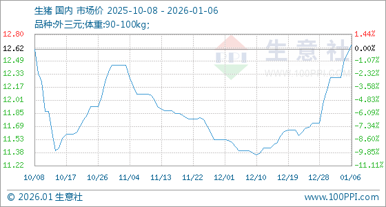 1月6日,生意社生猪基准价为12.57元/公斤,与本月初(12.28元/公斤)相比,上涨了2.36%。