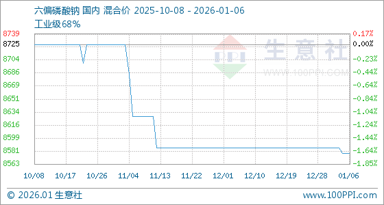 1月6日,生意社六偏磷酸钠基准价为8578.57元/吨 ,与本月初(8585.71元/吨 )相比,下降了0.08%。