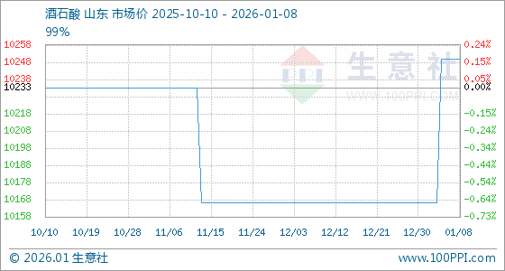 1月8日,生意社酒石酸基准价为10250.00元/吨,与本月初(10166.67元/吨)相比,上涨了0.82%。