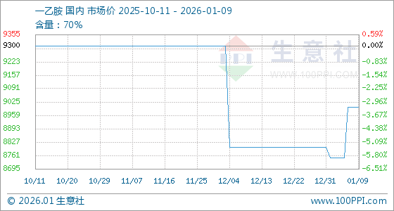 1月9日,生意社一乙胺基准价为9000.00元/吨,与本月初(8800.00元/吨)相比,上涨了2.27%。