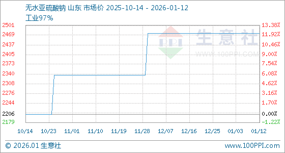 1月12日,生意社无水亚硫酸钠基准价为2475.00元/吨,与本月初持平。
