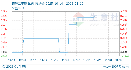 1月12日,生意社硫酸二甲酯基准价为3266.67元/吨,与本月初持平。