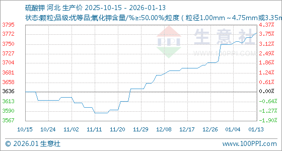 1月13日,生意社硫酸钾基准价为3773.33元/吨,与本月初(3750.00元/吨)相比,上涨了0.62%。