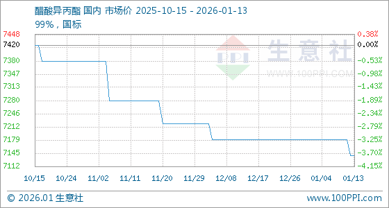 1月13日,生意社醋酸异丙酯基准价为7140.00元/吨,与本月初(7180.00元/吨)相比,下降了0.56%。
