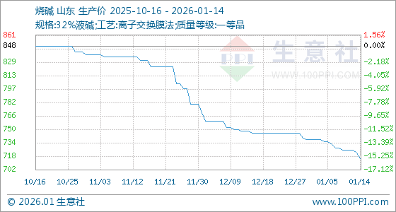 1月14日,生意社烧碱基准价为722.00元/吨,与本月初(738.00元/吨)相比,下降了2.17%。