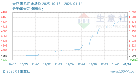1月14日,生意社大豆基准价为4468.00元/吨,与本月初(4416.00元/吨)相比,上涨了1.18%。
