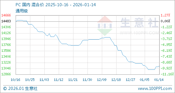 1月14日,生意社PC基准价为13100.00元/吨,与本月初(13200.00元/吨)相比,下降了0.76%。