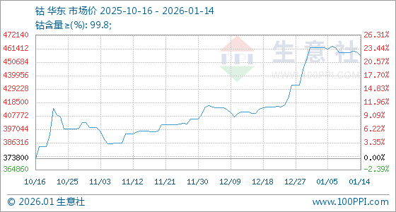 1月14日,生意社钴基准价为458900.00元/吨,与本月初(462100.00元/吨)相比,下降了0.69%。