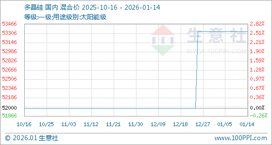 1月14日,生意社多晶硅基准价为53333.33元/吨,与本月初持平。