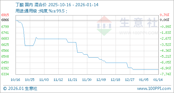 1月14日,生意社丁酮基准价为6383.33元/吨,与本月初持平。