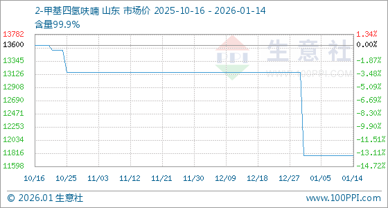 1月14日,生意社2-甲基四氢呋喃基准价为11780.00元/吨,与本月初持平。