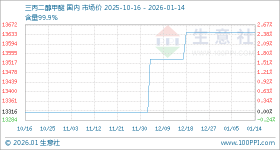 1月14日,生意社三丙二醇甲醚基准价为13640.00元/吨,与本月初持平。