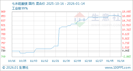 1月14日,生意社七水硫酸镁基准价为852.00元/吨,与本月初(850.00元/吨)相比,上涨了0.24%。