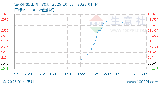 1月14日,生意社氯化亚砜基准价为2890.00元/吨,与本月初持平。
