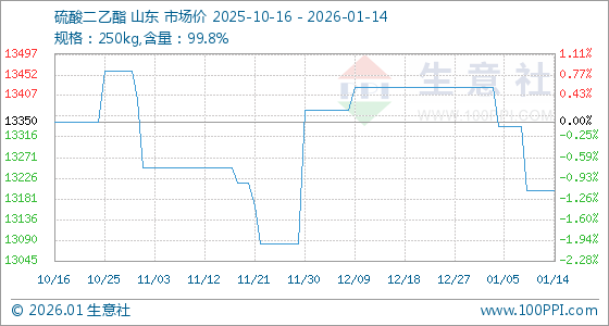 1月14日,生意社硫酸二乙酯基准价为13200.00元/吨,与本月初(13425.00元/吨)相比,下降了1.68%。