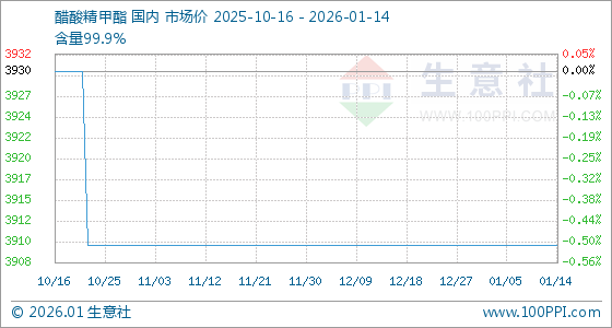 1月14日,生意社醋酸精甲酯基准价为3910.00元/吨,与本月初持平。