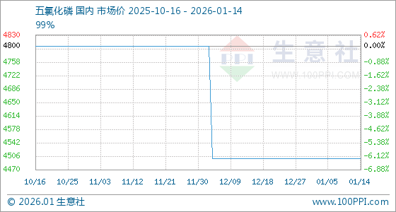 1月14日,生意社五氯化磷基准价为4500.00元/吨,与本月初持平。
