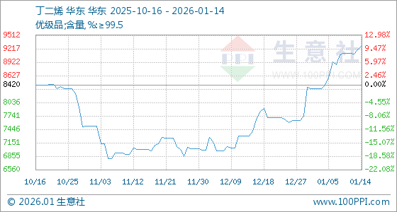 1月14日,生意社丁二烯基准价为9200.00元/吨,与本月初(8333.33元/吨)相比,上涨了10.40%。