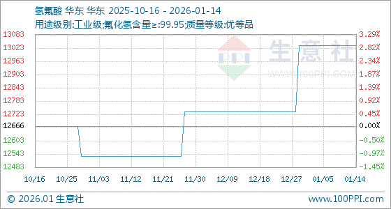 1月14日,生意社氢氟酸基准价为13033.33元/吨,与本月初持平。