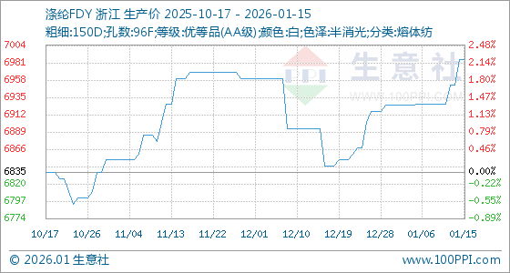 1月15日,生意社涤纶FDY基准价为6985.00元/吨,与本月初(6925.00元/吨)相比,上涨了0.87%。