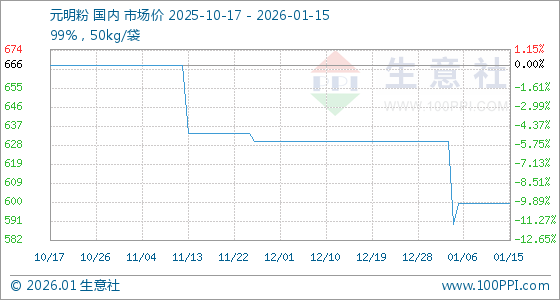 1月15日,生意社元明粉基准价为600.00元/吨,与本月初(630.00元/吨)相比,下降了4.76%。