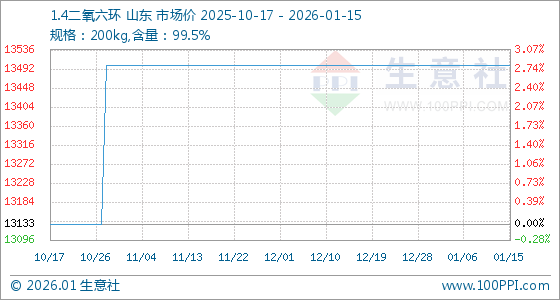 1月15日,生意社1.4二氧六环基准价为13500.00元/吨,与本月初持平。
