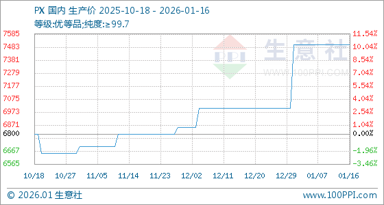 1月16日,生意社PX基准价为7500.00元/吨,与本月初持平。