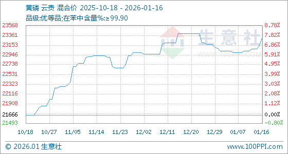 1月16日,生意社黄磷基准价为23150.00元/吨,与本月初(23033.33元/吨)相比,上涨了0.51%。