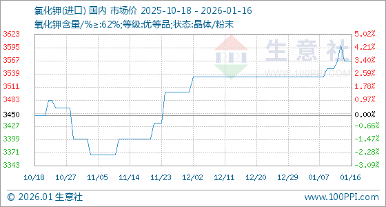 1月16日,生意社氯化钾(进口)基准价为3566.67元/吨,与本月初(3533.33元/吨)相比,上涨了0.94%。